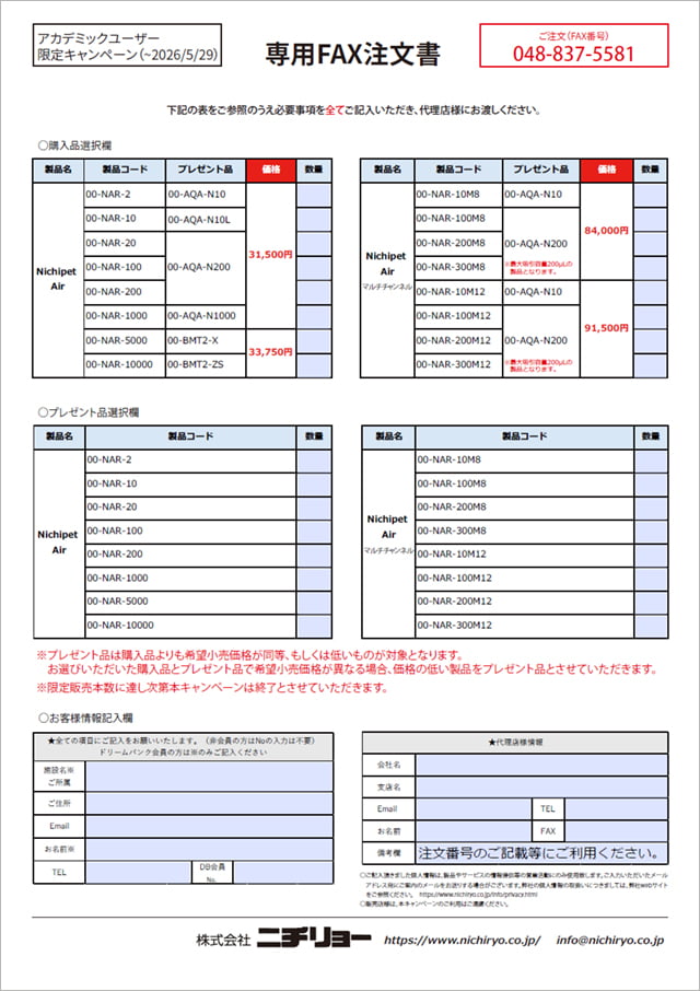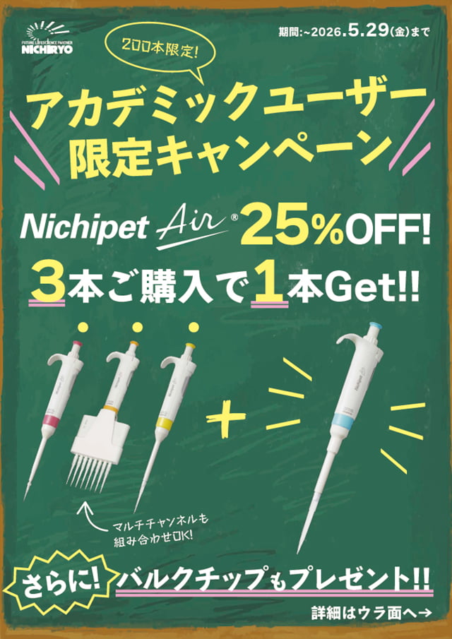 世界最軽量級マイクロピペット『Nichipet Air』が25%OFF1本ご購入毎に容量に応じたバルクチップもプレゼントいたします。